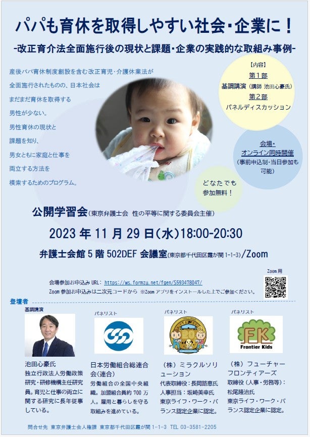 システムインテグレーション事業を行う株式会社ミラクルソリューション(所在地:東京都渋谷区、代表取締役:長岡 路恵)は、2023年11月29日(水)に東京弁護士会 性の平等に関する委員会が主催する公開学習会「パパも育休を取得しやすい社会・企業に!-改正育介法全面施行後の現状と課題・企業の実践的な取組み事例-」にパネリストとして参加いたします。
