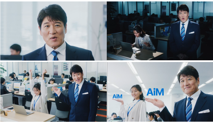 林先生が歩くオフィスの中で1人の男性社員が研修動画を楽しそうに視聴している。突然場面が変わり、必要な動画を見つけるのに四苦八苦している彼。そこで林先生が一言「AiM でしょ!」と。