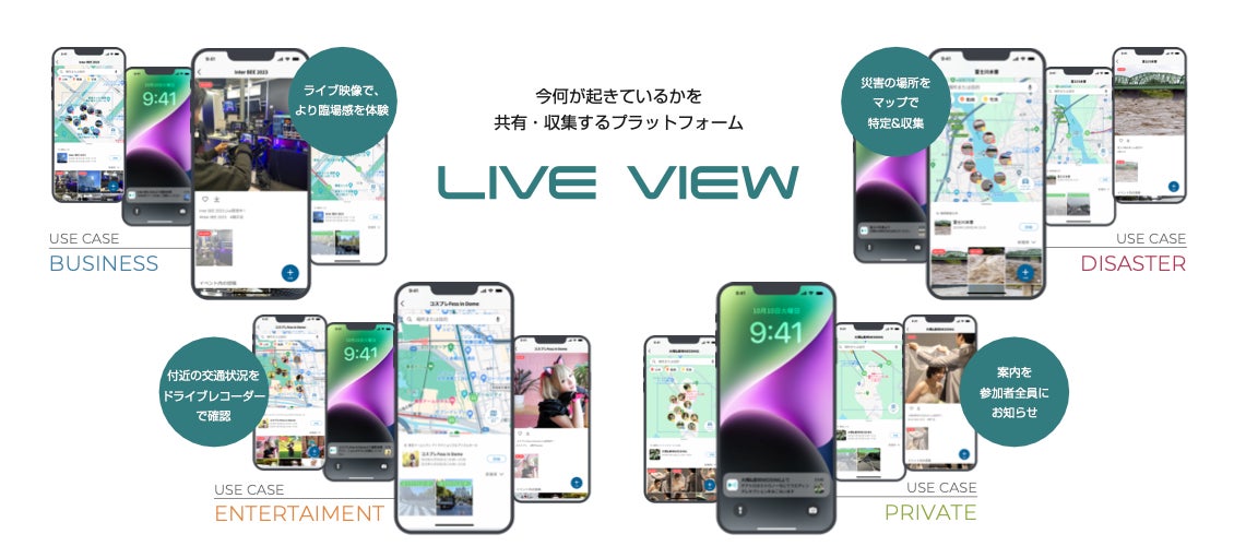 イベント・ニュース・災害等の出来事が生じた時に、特定の場所の、その瞬間の映像を得ることができます。従来のSNSがテキストや画像をリアルタイムでシェアするのに対し、LIVE VIEWは地図上の具体的な場所に関連する映像をリアルタイムで提供します。これにより、位置情報に基づいた今のコンテンツの共有が実現します。
