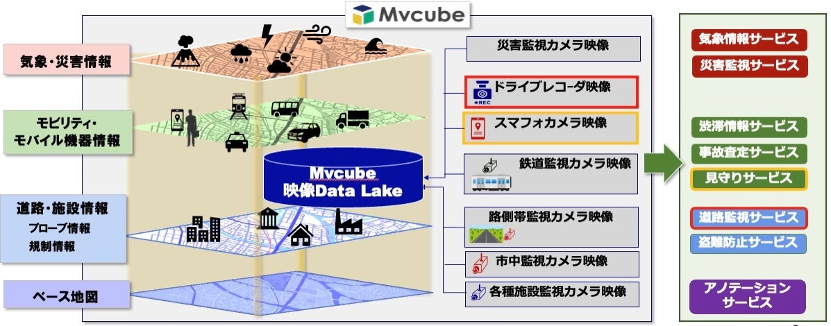 また、収集したドライブレコーダーの車外映像を活用することで、監視車両や監視カメラを設置することなく街の安心安全や災害監視用途での利用が可能になるなど、新たなビジネス価値を創生します。