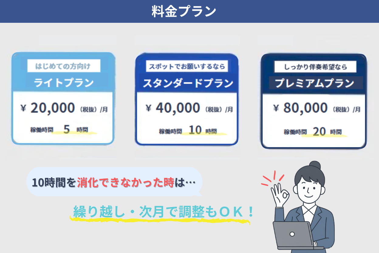 専任スタッフを採用するより低コストで、必要な業務だけを柔軟にアウトソース可能。小規模企業でも導入しやすい料金設定です。
