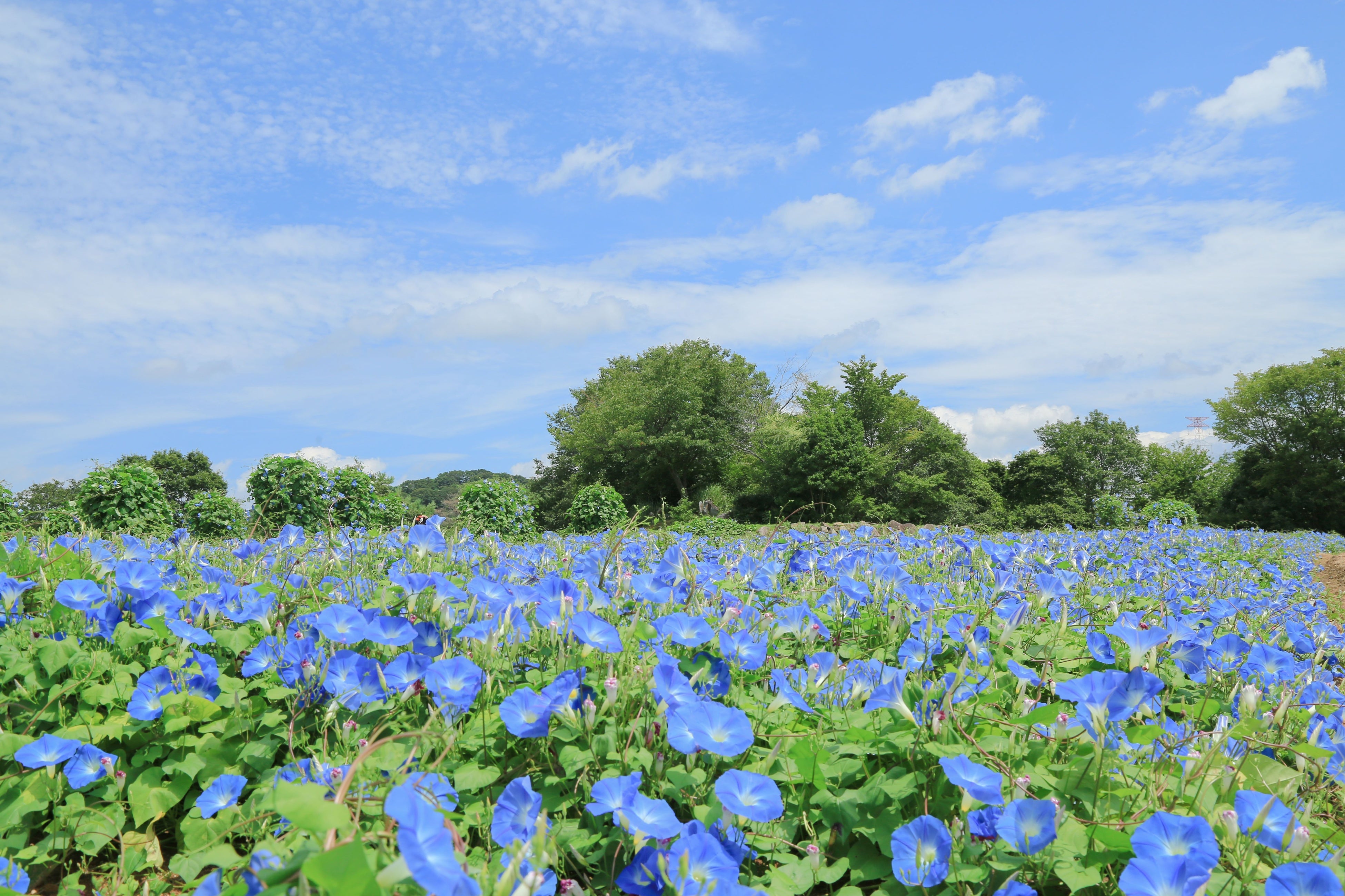 一面に広がる鮮やかな青色の西洋アサガオ、ヘブンリーブルー。「天空の青」という意味で晴れ渡った青空を思い起こさせる美しい空色の花が特徴です。花と青空とが一帯となって作り出す爽やかなブルーの丘をお楽しみいただけます。