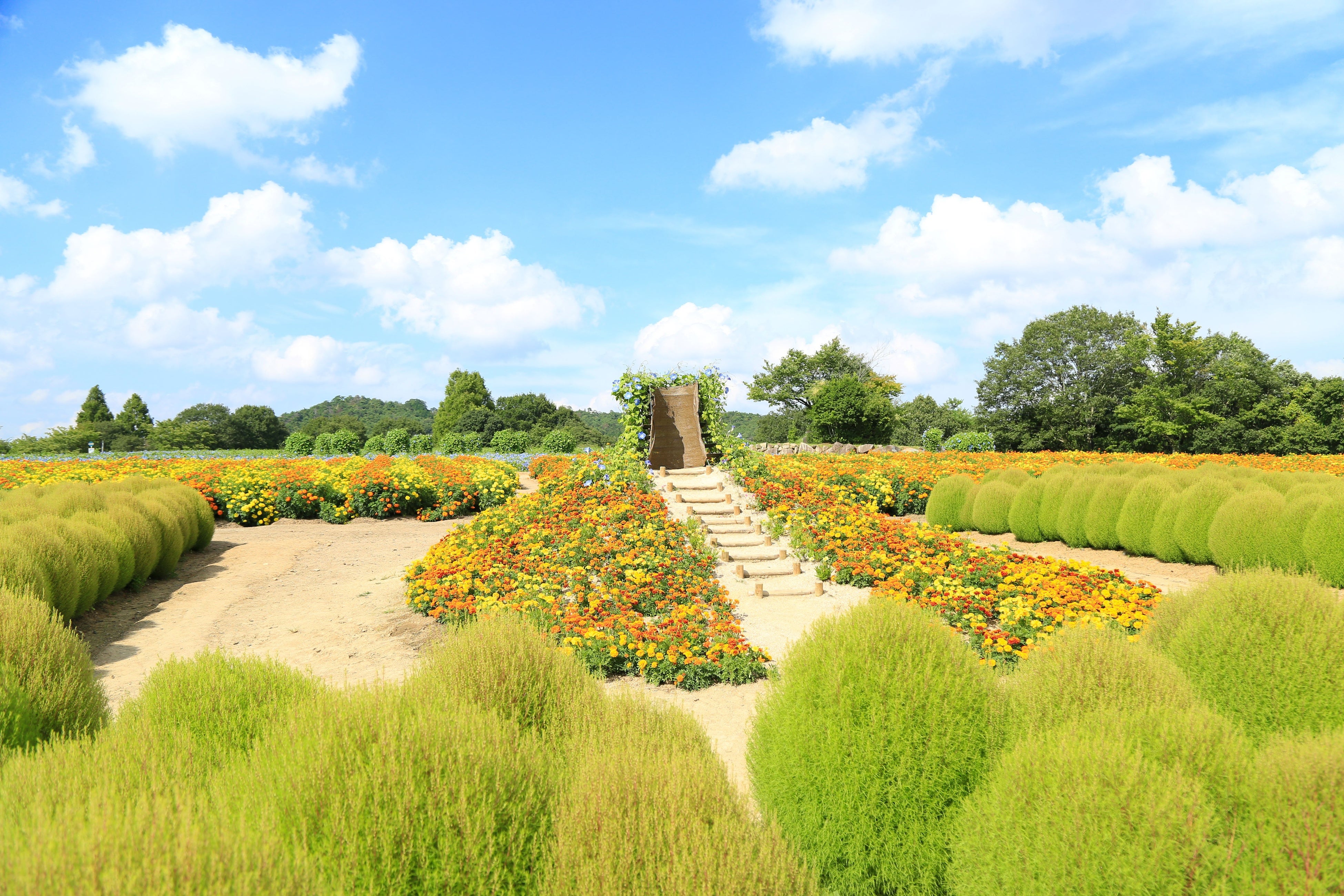 マリーゴールドやコキアが植栽されたエリアです。一株が大きく背丈の高い品種のマリーゴールドは、花弁が密に重なった手毬のような大輪の花を咲かせます。迫力のあるビタミンカラーの花畑になります。