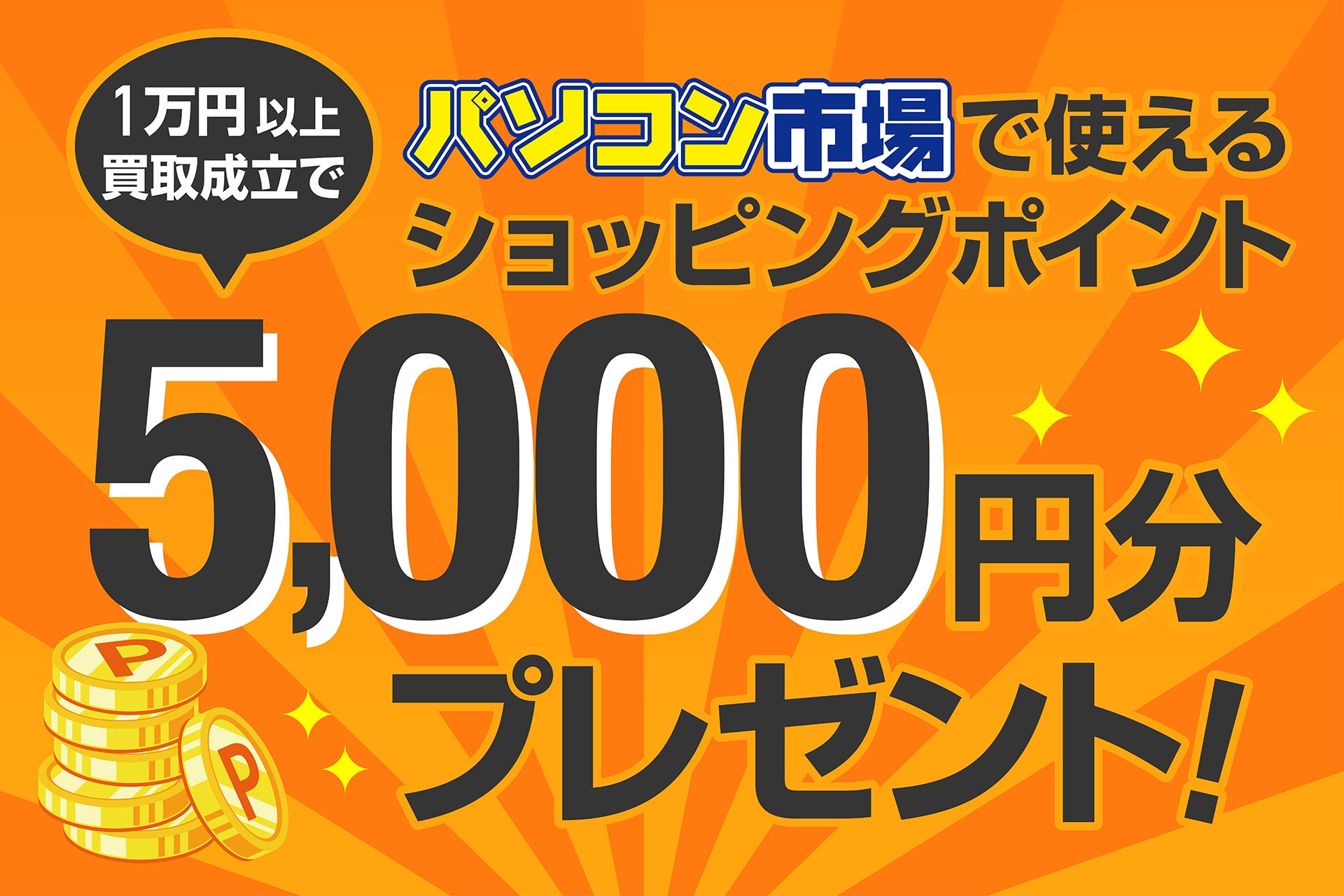 1万円以上の買い取り成立で、パソコン買取市場ECサイトで受付の場合にはパソコン市場ECサイトにて使用できるポイント5,000円分を、パソコン市場店頭で受付の場合には店舗で使用できる5,000円分の商品券をプレゼントいたします。2023年1月31日(火)までの期間実施しています。