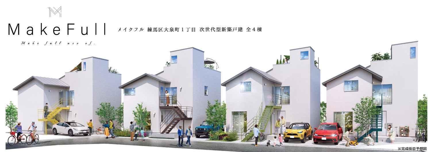 全4棟の新築住宅【メイクフル】と命名し、2023年6月下旬の完成に向け、5月18日(木)より住協ホームページやスーモ等のポータルサイトにて予告広告を開始します。販売は7月以降を予定しています。