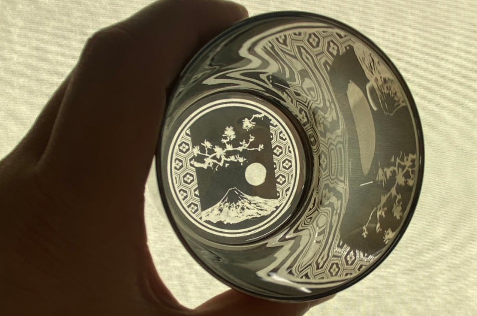 「宇宙開発技術」と「職人の手仕事」から創られた飲み物の個性を引き出すグラス。光を当てる角度によって無限に変化する。底には富士山が見えます。