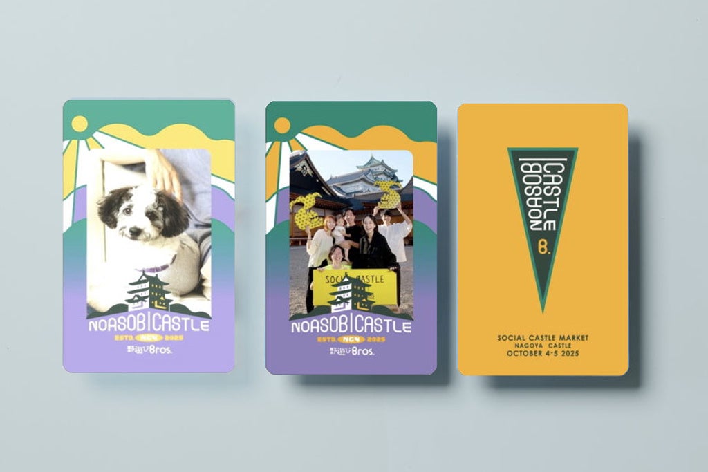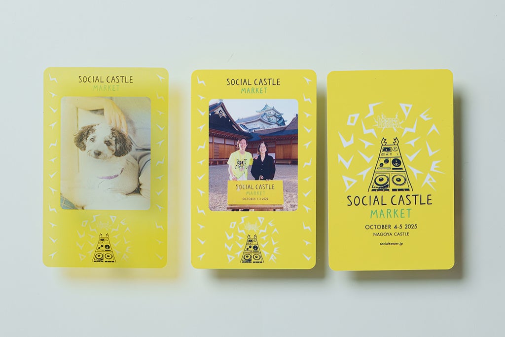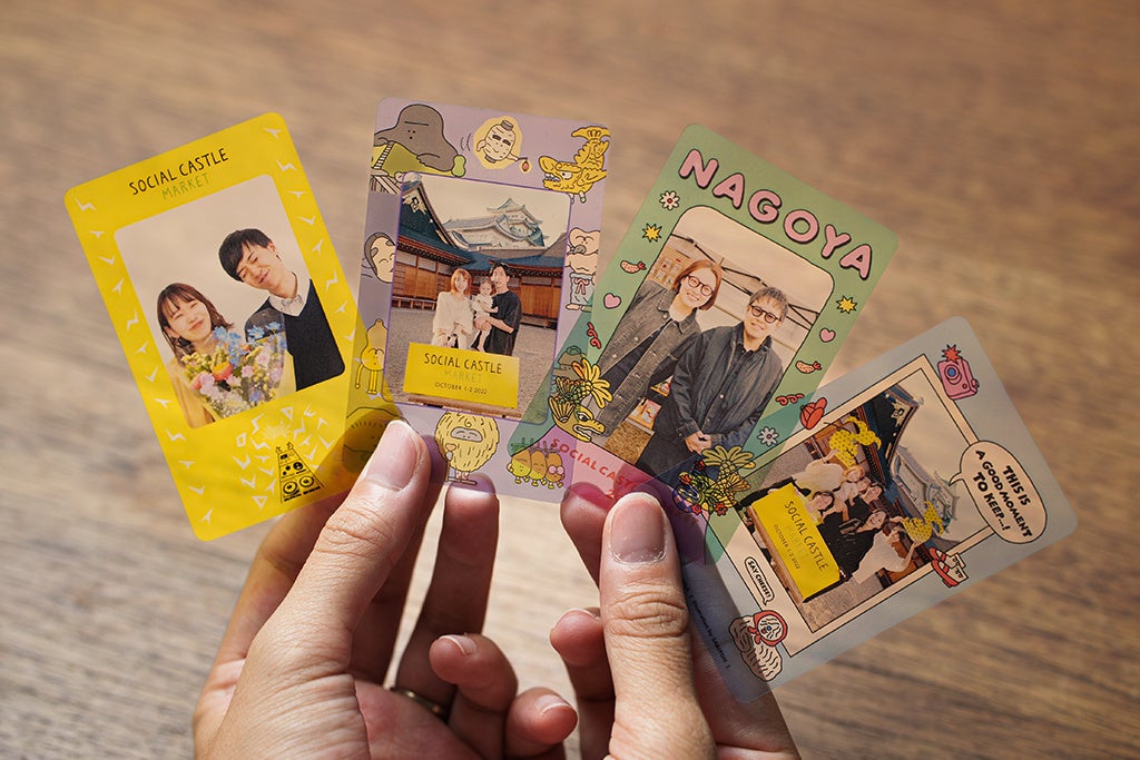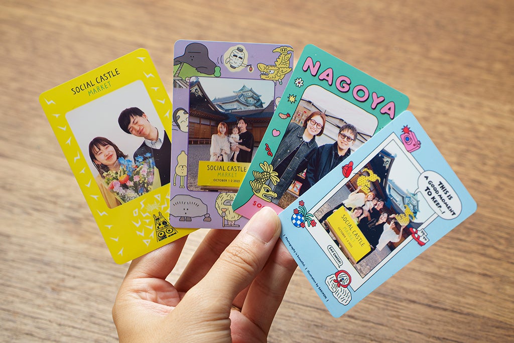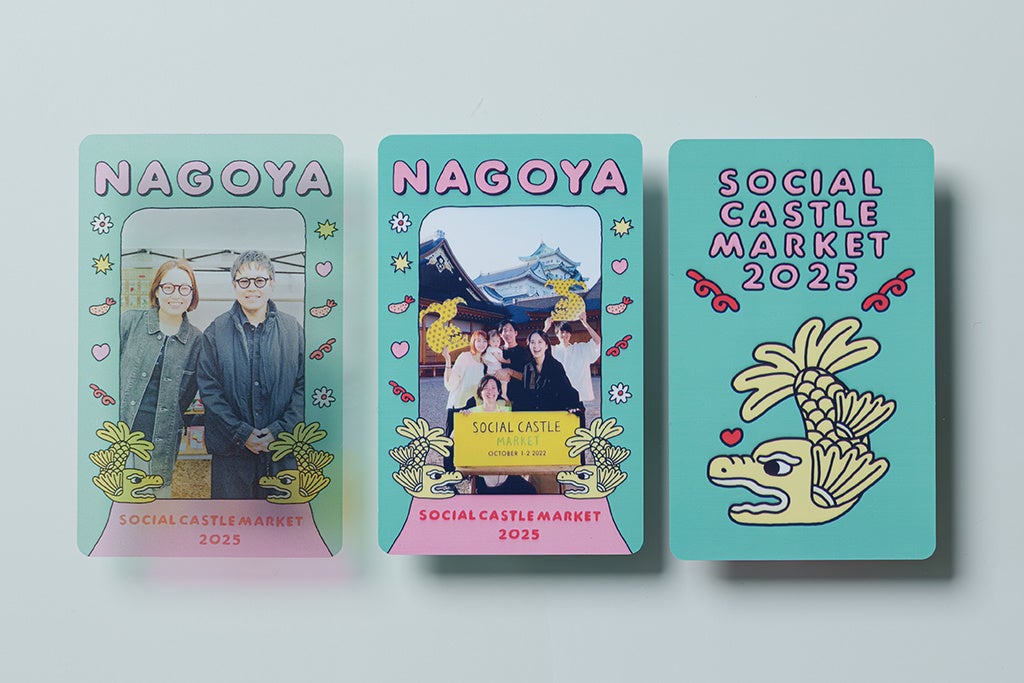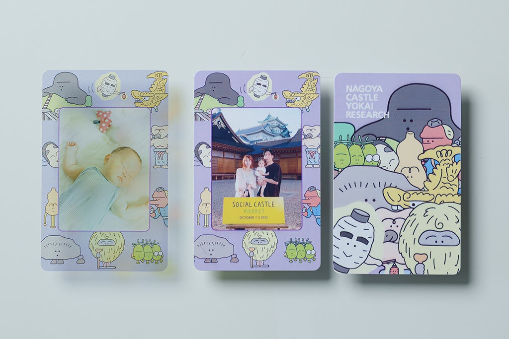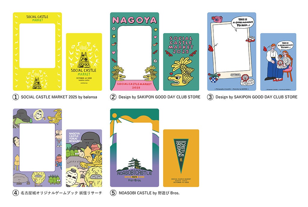 ①balansaによるMARKET2025のビジュアルデザインに加えて、名古屋城オリジナルゲームブック「妖怪リサーチ」に登場するお城を守る妖怪たちが描かれたデザイン、GOOD DAY CLUB STOREのイラストレーターSAKIPONさんが描いた2種類のデザインの両面・透明トレカとフォトパネル「デコールL」が即日作れます。(急遽、NOASOBI CASTLE by 野遊びBros.デザインも追加)