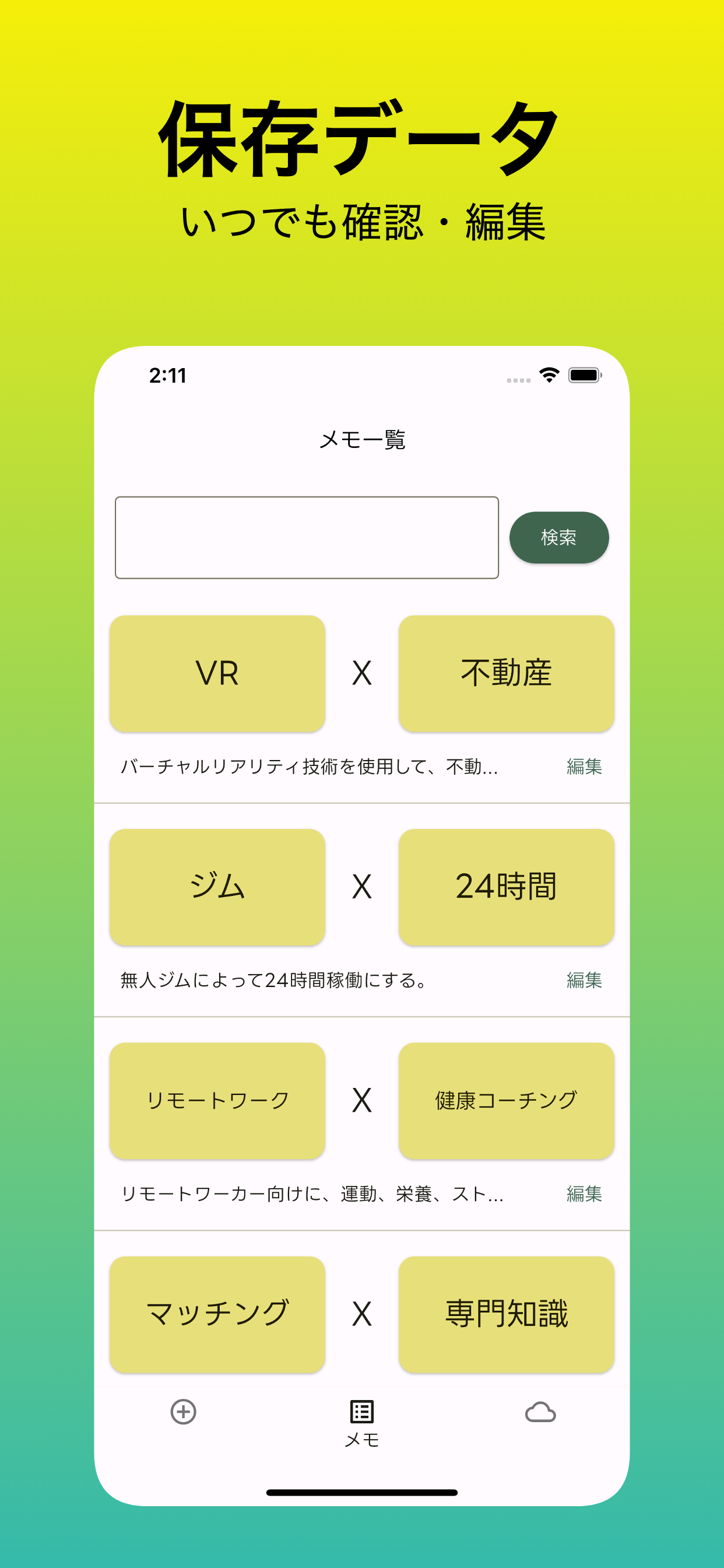・保存データと検索機能: 保存されたアイデアを編集することができます。また、検索機能があるため、手軽に過去のアイデアを振り返り、発展させることが可能です。