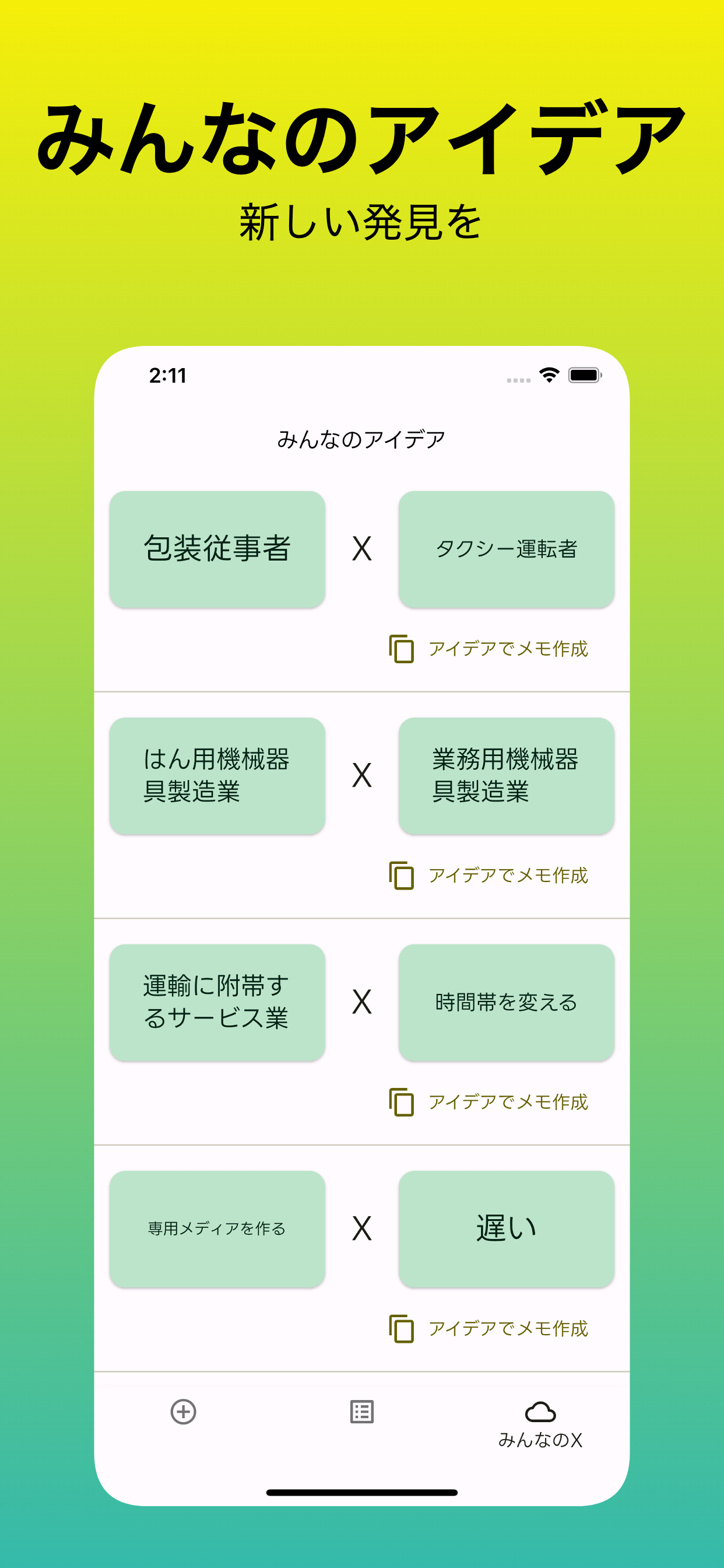 通勤時間や休憩中などのスキマ時間などを活用して、Xアイデアを毎日利用して、発想力を鍛え、世界を変える可能性を秘めたアイデアを見つけましょう!