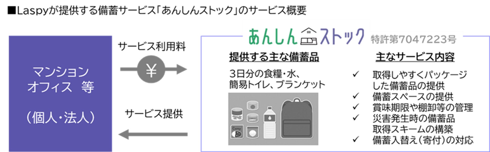 Laspyが提供する「あんしんストック」は、防災備蓄の保管・管理・入替・廃棄・災害時の提供を一括で行う新しいカタチの防災備蓄サービスです。