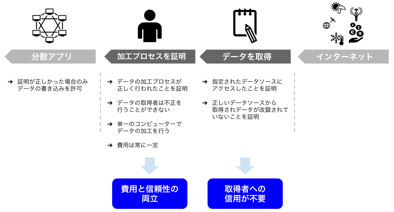 インターネット上のデータを分散アプリで利用可能にすることは簡単ではありません。インターネット上のデータが正しいプロセスで持ち込まれたかを検証することが難しいからです。ブロックチェーンは誰でも匿名で利用できる設計になっているため持ち込まれるデータは自己申告であり出鱈目なデータが書き込まれる可能性があります。データの信頼性を担保するにはブロックチェーンが以下の2点を検証できる必要があります。
