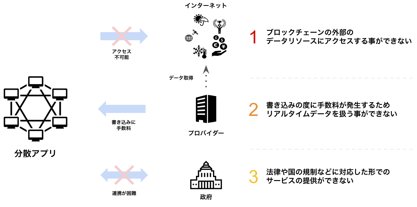 分散アプリの課題はブロックチェーン外部のデータの参照が困難なことです。既存の分散アプリで扱うことのできるデータは仮想通貨とNFTなどの仮想資産に限定されており、これにより金融分野でしか利用することができない技術になっています。また、分散アプリでは書き込みの度に手数料がかかるため扱うことができるデータの性質も限定されます。