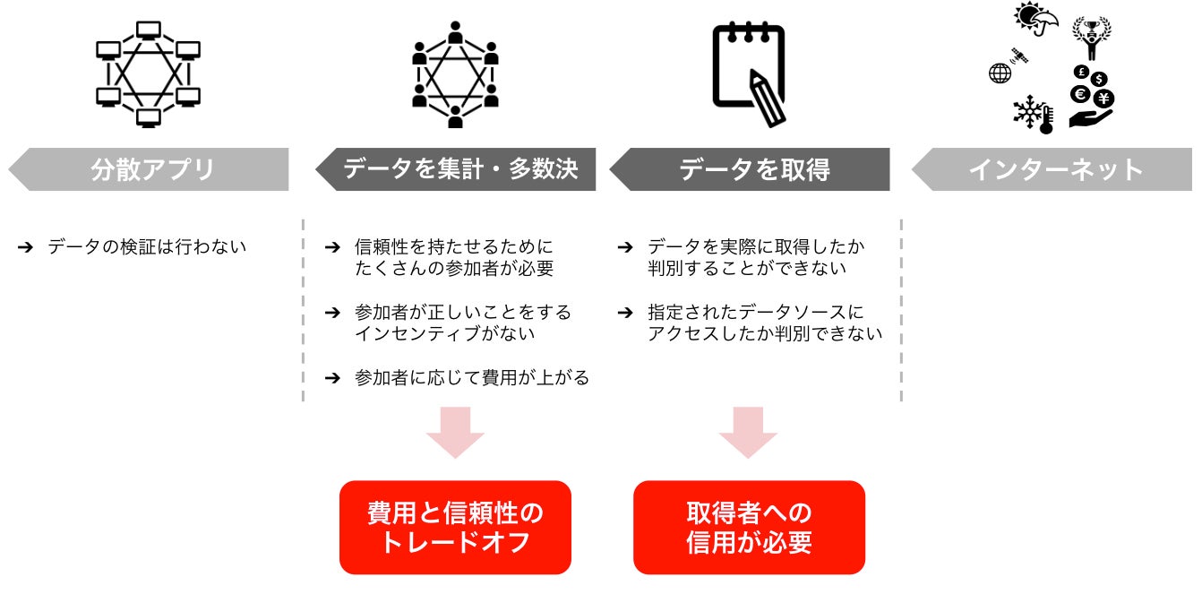 既存のサービスではこれらに関する検証は行われず多数決で決められています。利用者かサービスプロバイダーまたは第三者のオフチェーンオラクルサービスがデータの取得に用いられます。そのためデータの取得者へのトラストが必要であり第三者サービスを用いた場合は高額な利用料が必要です。