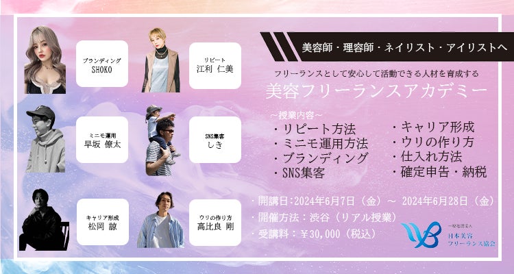 一般社団法人 日本美容フリーランス協会(代表理事:石原一樹、所在地:東京都渋谷区)は、美容業界で働くフリーランスの方々を対象に、アカデミーという形で必要な知識・情報を提供し、フリーランスとして安心して活動できる状態に育成するプロジェクトを開始いたします。