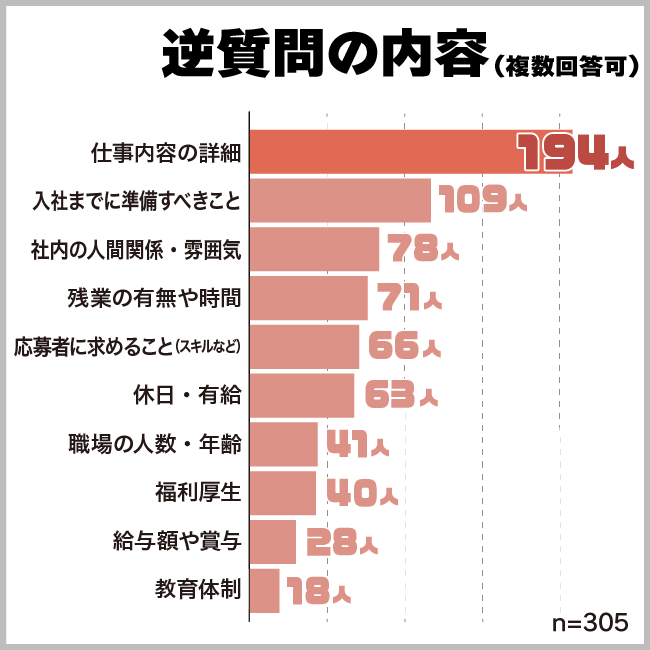 全体の39%は逆質問をしなかったことになりますが、熱意をアピールし、他のライバルとの差をつける大きなチャンスですから、質問しない手はありません。