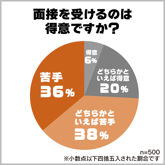 「面接を受けるのは得意ですか」という問いに対し、「どちらかといえば苦手」と答えた人が38%、「苦手」が36%でした。7割以上の人が苦手意識を持っているようです。
