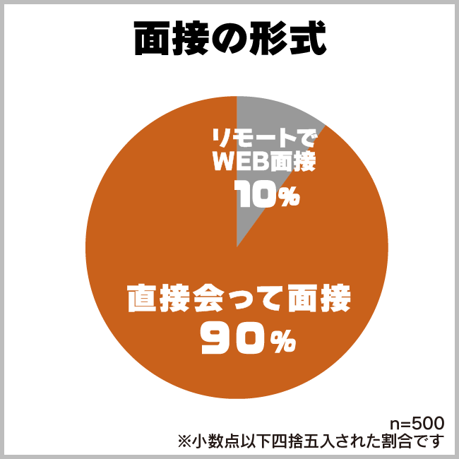 面接方法ですが、コロナ禍になってからリモートでの面接が増えていましたが、意外にも「直接会って面接した」という人が90%でした。リモートでのWEB面接は10%にとどまっています。