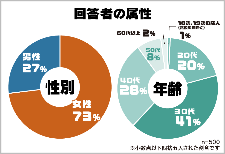 アンケートに答えてくださったのは男女500人、性別や年代の割合は以下の通りです。
