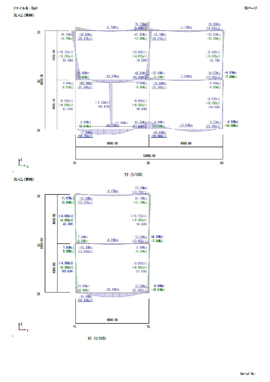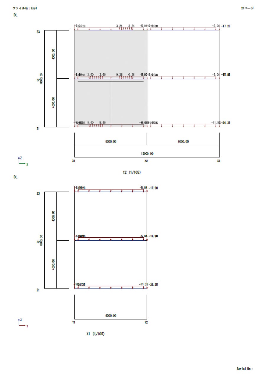 入力データ、弾性応力解析結果、固有値解析結果、偏心率・剛性率計算結果、断面計算結果を、図表に富んだグラフィック形式で、一括出力します。
