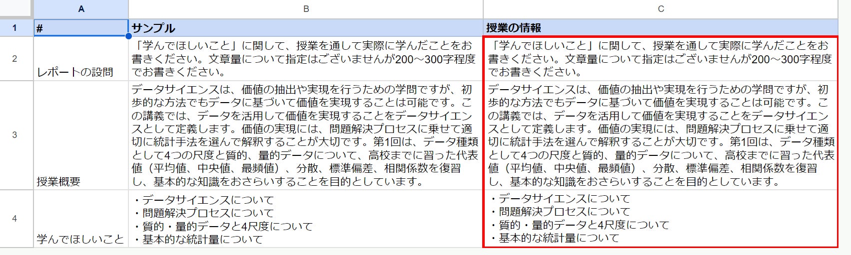 まずは専用のスプレッドシートに授業の情報を入力します。記述内容の粒度感については、同シート内にサンプルをご用意していますので、併せてご確認いただきながら入力します。