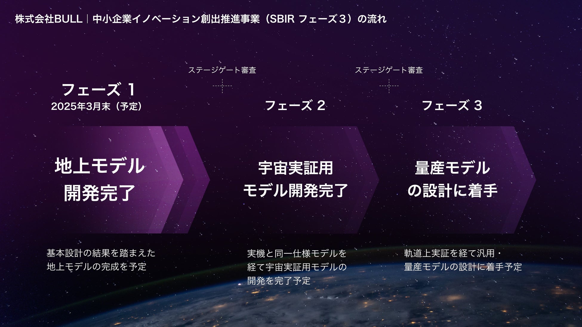 まず、フェーズ1として基本設計の結果を踏まえた地上モデルを完成させることを予定しています。今後は、ステージゲート審査を経て、フェーズ2では実機と同一仕様モデルを経て宇宙実証用モデルを開発完了させ、フェーズ3では軌道上実証を経て汎用・量産モデルの設計に着手することを予定しています。