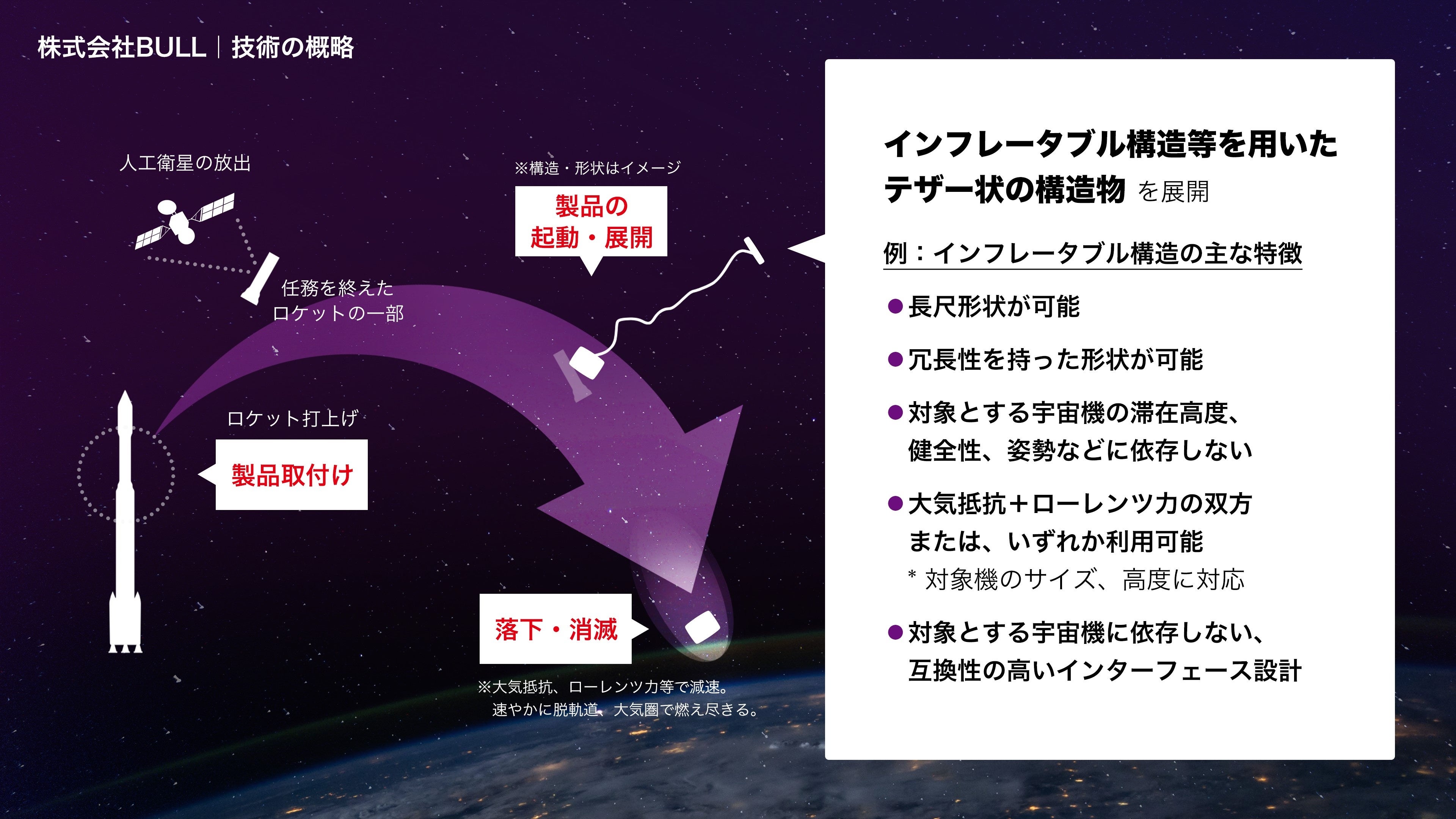 BULLでは、宇宙空間におけるスペースデブリの抑制のうち、今後スペースデブリを増やさないこと、に資する事業として、衛星等の宇宙機のデブリ化を⾃律的に防⽌する装置を開発しています。PMD(Post Mission Disposal)と呼称される本装置は衛星等の宇宙機に予め搭載しておくことで、運用終了後、インフレータブル構造を有するテザー状の構造物を展開し、大気抵抗や電磁力によるブレーキ力を用いて搭載先の宇宙機を減速させます。その結果、同宇宙機の軌道上での滞在期間を大幅に短縮させることができ、宇宙デブリの発生を将来に向かって防止することが可能となります。