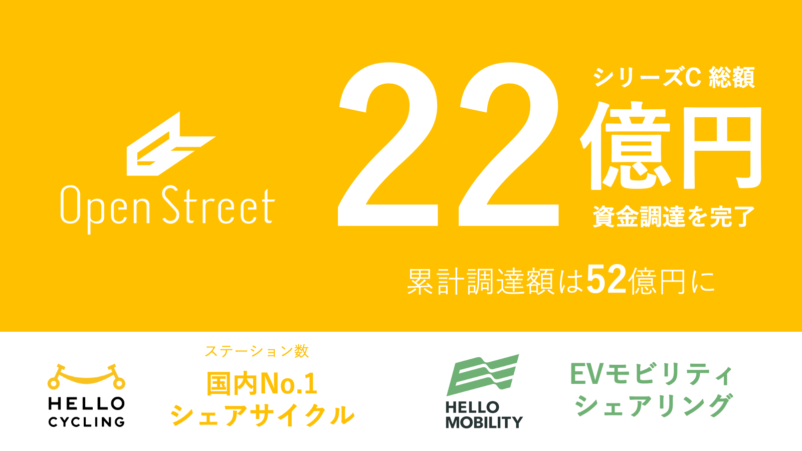 モビリティのシェアリングプラットフォーム「HELLO CYCLING」「HELLO MOBILITY」およびスマートパーキング「BLUU Smart Parking」を提供するOpenStreet株式会社(以下「OpenStreet」)は、JICベンチャー・グロース・インベストメンツ株式会社をリードインベスターとし、複数社を引受先とする第三者割当増資により、約22億円の資金調達を実施しました。この度の調達により累計調達額は約52億円となります。