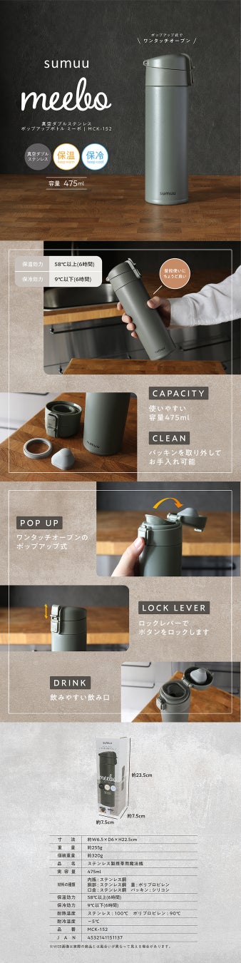 【新商品】ライフスタイルブランドsumuuより、真空断熱のダブルステンレスで、保温保冷に優れたボトルシリーズ「ミーボ」を発売