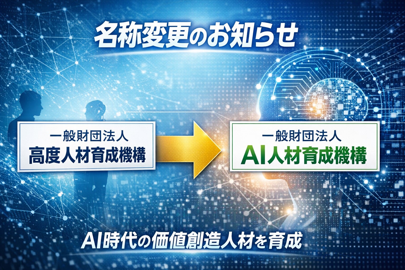 このたびの名称変更は、AI時代における人材育成を担う機関としての役割を明確にするものです。また、名称から「高度」という文言を外すことで、当機構が育成する人材を高度IT人材に限定するのではなく、誰もがAIを用いて価値創造を担うことが求められる時代であるという考え方を示すものです。