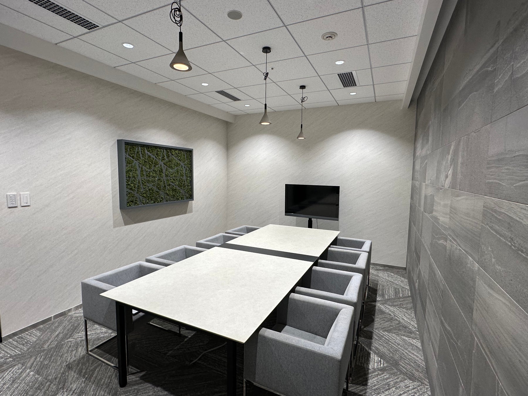 会議室の壁面には「スカンディアモス」を採用しております。天然素材100%のスカンディアモスを使用している為、室内の空気浄化と湿度調整を行う効果があります。グラングリーン大阪の弊社新オフィスから、サステナブル・ウェルビーイングな取り組みを行ってまいります。
