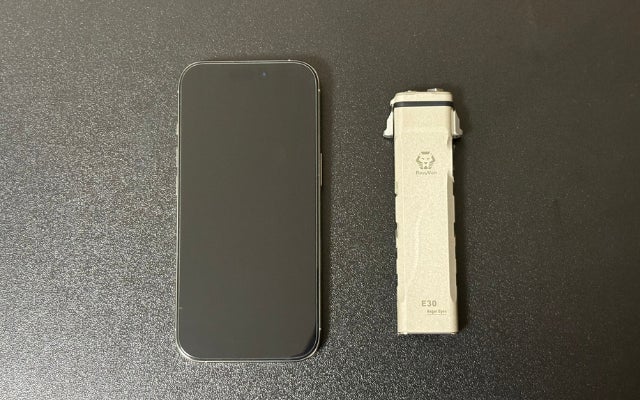 E30(MAO Limited)の大きな特徴が、コンパクトなボディサイズからは想像できないような白く明るい光で周囲を照らす7500Kの高輝度LEDユニット。iPhoneの内蔵ライトを比べると、その明るさの違いは歴然だ。