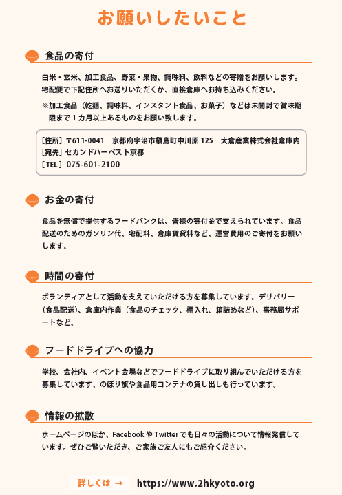 食品は主に京都府下の企業ならびに個人の皆さまからの寄贈品となりますが、1世帯15kg前後の食品をお届けしますので、足りない分は栄養面も考慮しながら購入して賄います。