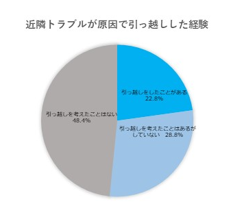 近隣トラブルを経験した方の内、トラブルが原因で実際に「引っ越しをしたことがある」人は22.8%も存在することが分かりました。また、「引っ越しを考えたことはあるがしていない」人は28.8%となっており、「近隣トラブルが原因で引っ越しを検討したことがある人」という観点では、半数以上にものぼることが分かります。