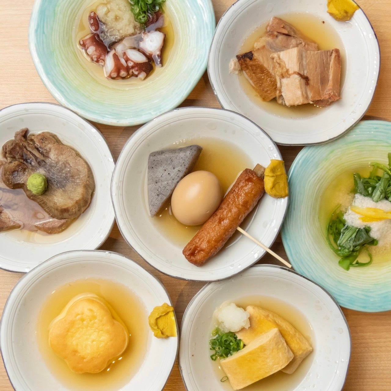 おでんは、かつおと昆布の出汁をベースに、国産⽜すじや栗を餌として育った⽢みのある豚と、練りもの、⼤根や春菊などの野菜を⼀緒に煮込んでおり 、上品でいて奥深い味わいが特徴的です。提供するうどんはおでん出汁を最⼤に⽣かせるよう平打ち麺を使ってグツグツ煮込み、⼩⻨の味をしっかり残しつつ、出汁の⾵味も感じられる仕上がりとなっています。