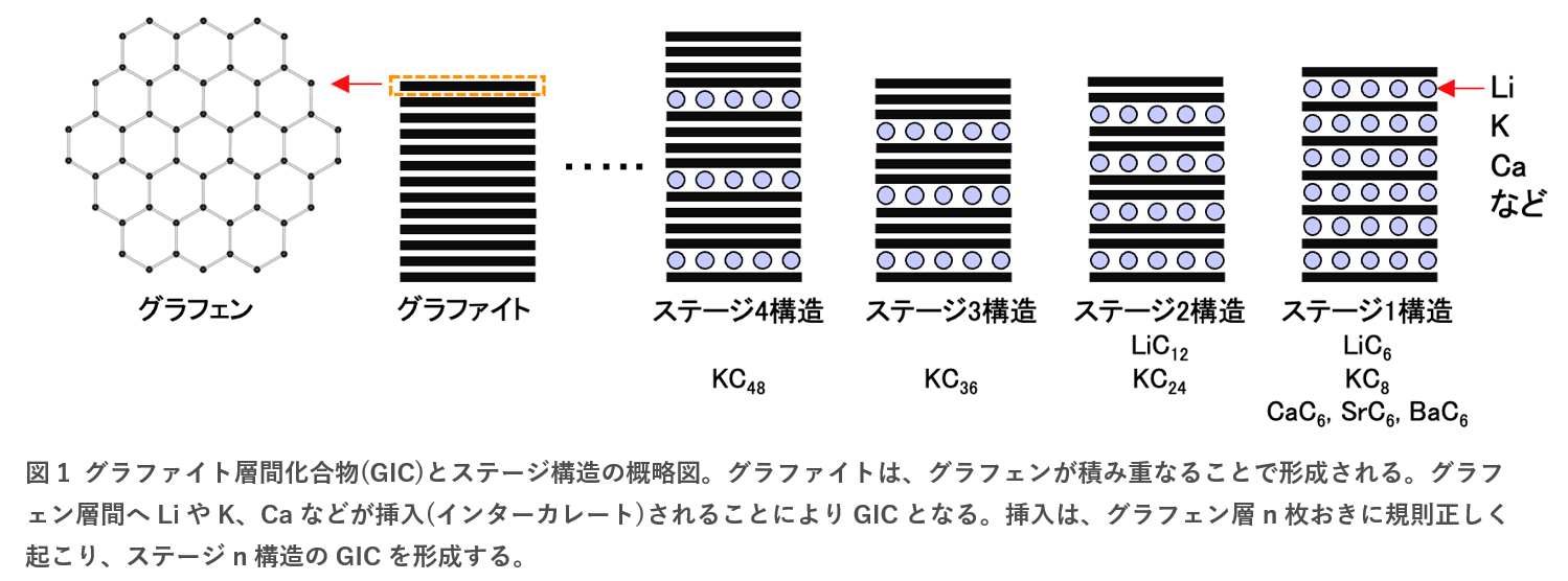 層間に入る原子の種類により多種のGICが存在し、それぞれが高導電性やガス吸蔵性、超伝導性など、多様な機能を有しています。グラファイトへのインターカレーション現象は、リチウムイオン二次電池の電極でも利用されています。最近では、GICを原料にしたグラフェン合成技術も開発され、今後もさまざまな応用が期待されます。しかし、気相法や溶融塩法などの従来のGIC合成手法は、合成プロセスが複雑で、合成に数日〜数週間を要し、ステージ構造(図1)の制御が容易ではなく、高価な高配向性グラファイト原料が必要など、高品質試料の大量合成には不向きでした。そのため、GICの実用化に向けて、革新的なGIC合成法の開発が望まれていました。