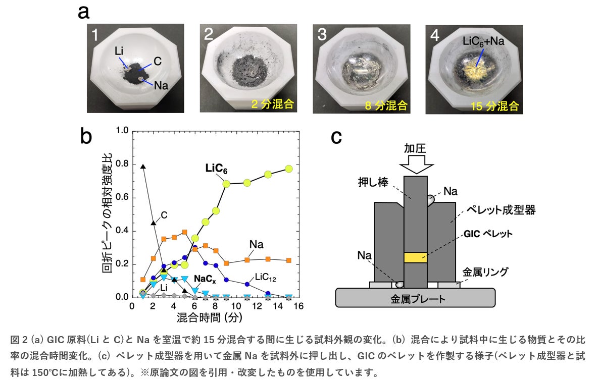 このNa触媒法で合成した試料には、必然的に金属Naが残留します。そこで、試料中の金属Naを低減する手法も開発しました。まず、試料をペレット成型器に入れて150 ℃(金属Naの融点である98 ℃以上)に加熱します。次に図2cに示すように、押し棒で試料を加圧することにより、液体となった金属Naが試料外に押し出され、稠密なGICペレットを得ることができました。