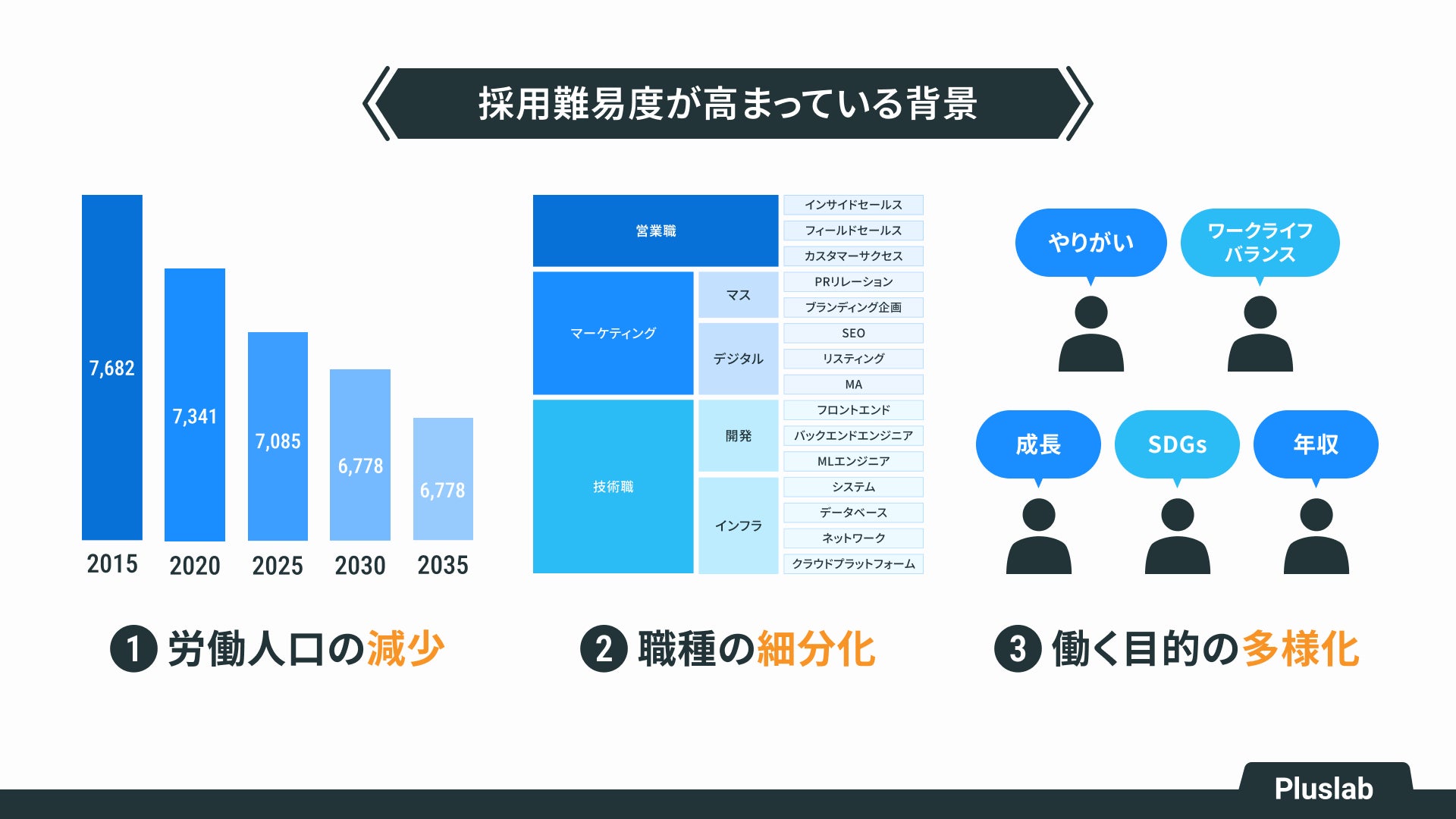 昨今の採用市場においては、以下の3つの理由から採用難易度が急速に高まっています。