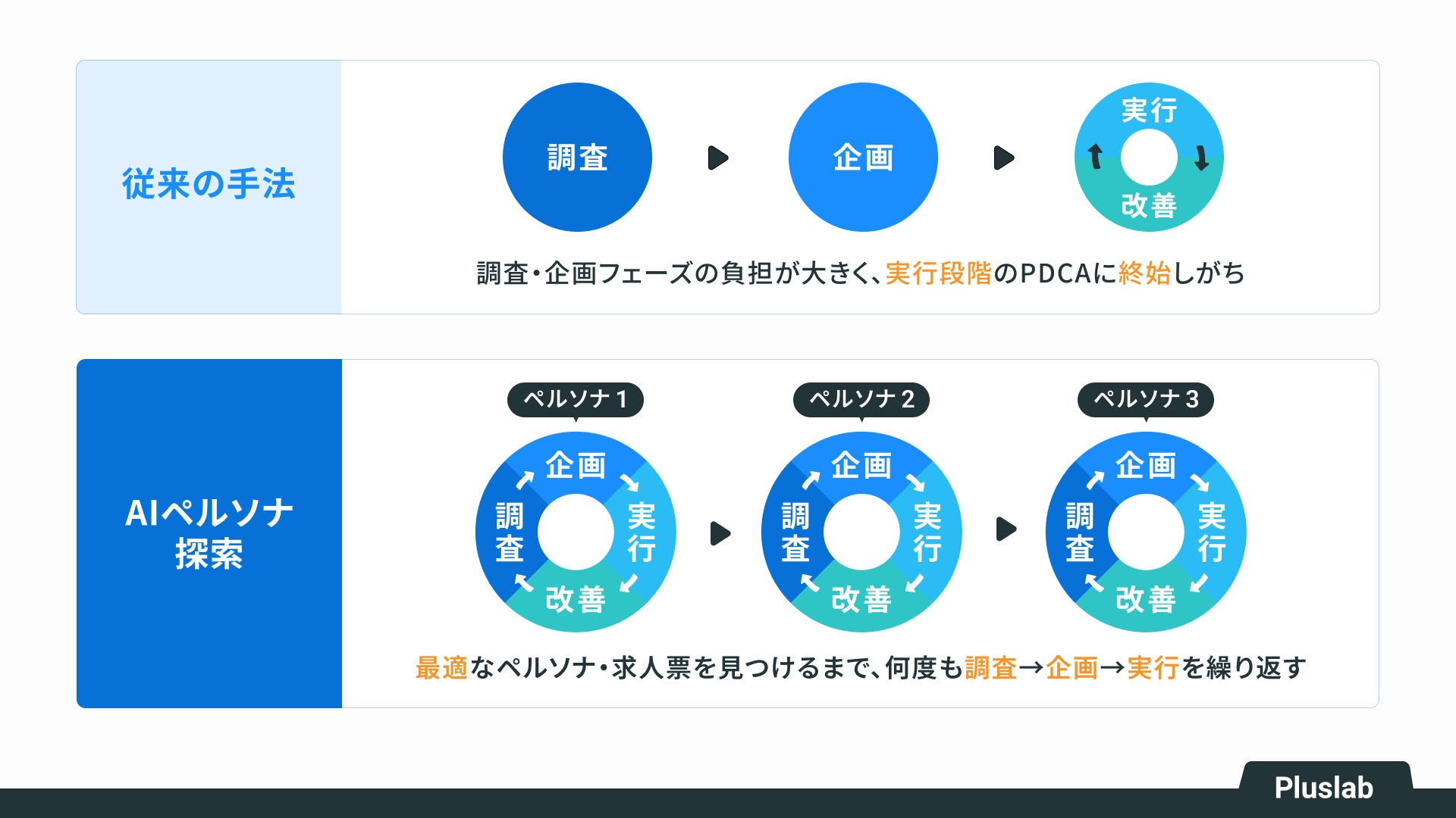 Pluslabシリーズでは、AIのアシストを強力に活かし調査・企画フェーズからPDCAを高速に回すことで採用効率を高める、次世代型の採用戦略「AIペルソナ探索」を実現します。