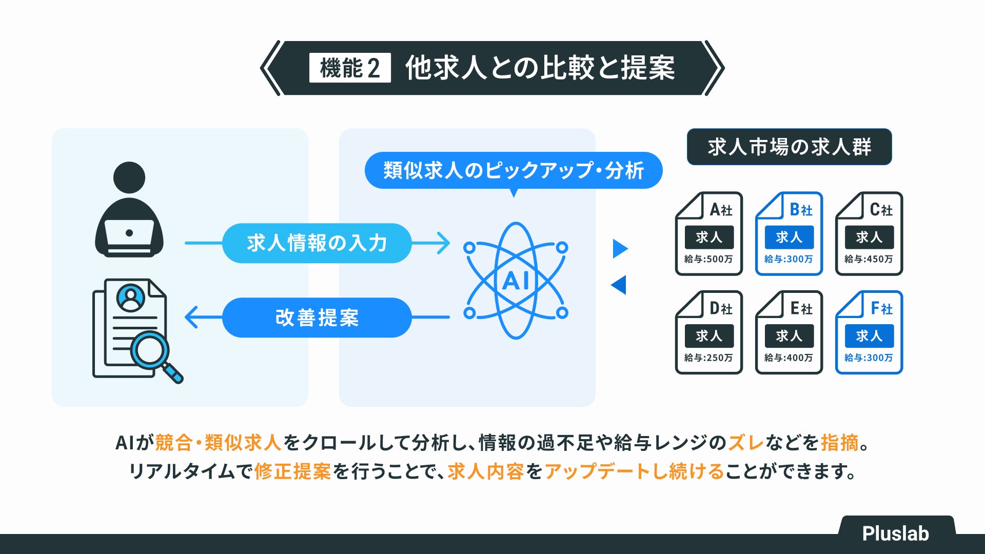 AIが競合・類似求人をクロールして分析し、情報の過不足や給与レンジのズレなどを指摘。リアルタイムで修正提案を行うことで、求人内容をアップデートし続けることができます。