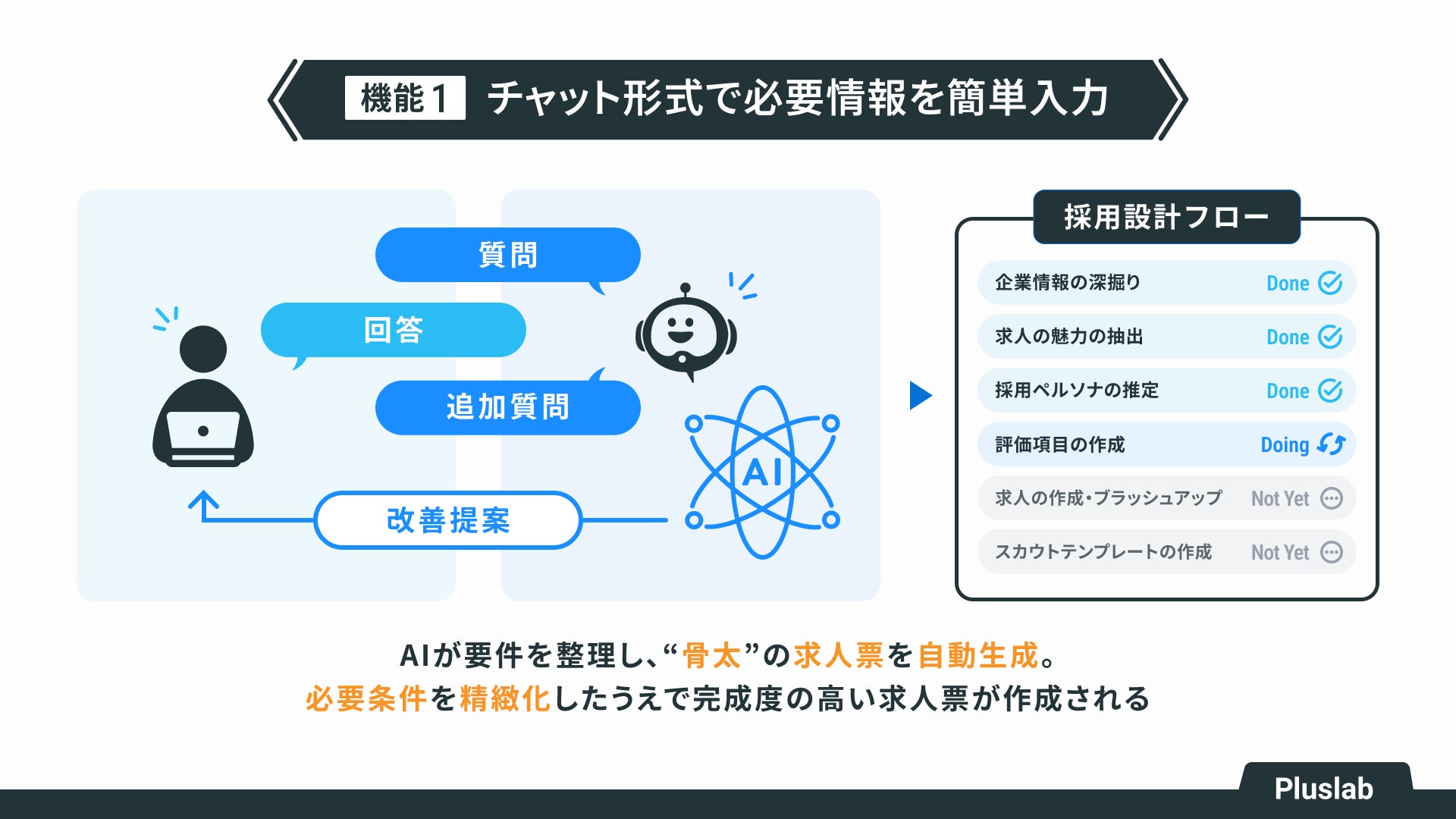 Pluslab社はこうした採用の課題に対して、AIエージェントを活用することによって採用要件の設計と実行プロセスを効率化し、採用担当者がより本質的な課題に向き合えるようサービスを展開していきます。