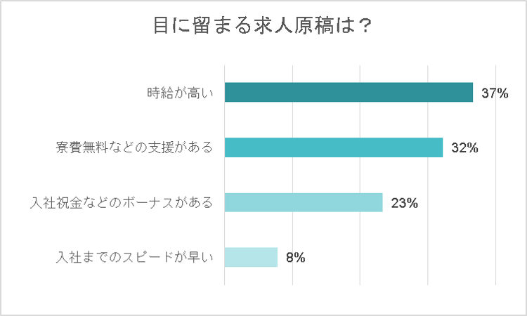 目に留まる求人原稿で最も高い結果がでたものは「時給が高い」でした。そして、「寮費無料などの支援がある」と「入社祝金などのボーナスがある」が続いていることから、求職者は給与面を最も重視しながら求人を見ていることが読み取れます。これも20代のアンケート調査と同じ結果となっております。