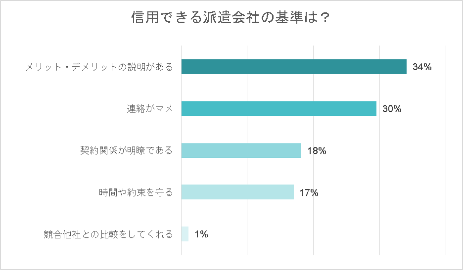 信用できる派遣会社の基準として最も高かった内容は20代と変わらず、「メリット・デメリットの説明がある」企業でした。メリットのみの説明だと、ミスマッチが発生してしまうため、デメリットもしっかりとお伝えする必要があると考えられます。また、次に「連絡がマメ」なことも同様に高い数値を出しております。また、「契約関係が明確である」や「約束や時間を守る」というところも同様な数値が出ているため、求職者との密なやり取りが信用に繋がると考えます。