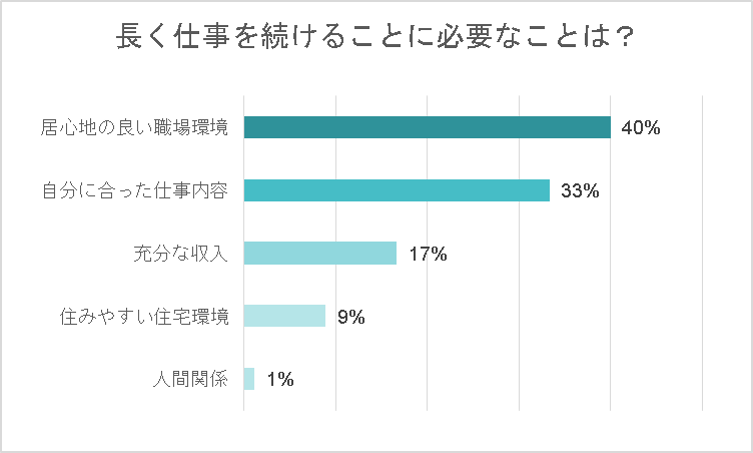 20代のアンケート結果では「自分に合った仕事内容」が最も高かったのに対し、30代は「居心地の良い職場環境」が最も高い結果となりました。この結果から、年齢が上がると、腰を据えて働きたいと感じる人が多いことが読み取れます。また、求人を見ている際には給与面が高かったのに対し、ここでは収入は17%と低い数値になっております。