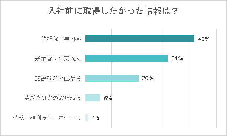 入社前に取得したかった情報として、「詳細な仕事内容」が最も高い数値となりました。また、続いて「残業を含んだ実収入」が高い数値を出しております。Q2,Q3の結果でもある通り、やはり求職者の方は給与面を重視している方が多いということが分かります。