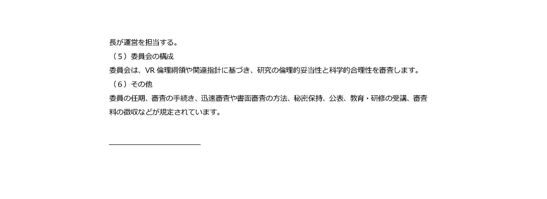 加えて、「VR研究倫理審査委員会」は、審査実績を蓄積した上で、VR研究倫理に関するFAQやガイドラインの策定を進めるとともに、新たに審査できる人材の育成も認定試験や検定を実施してまいります。
