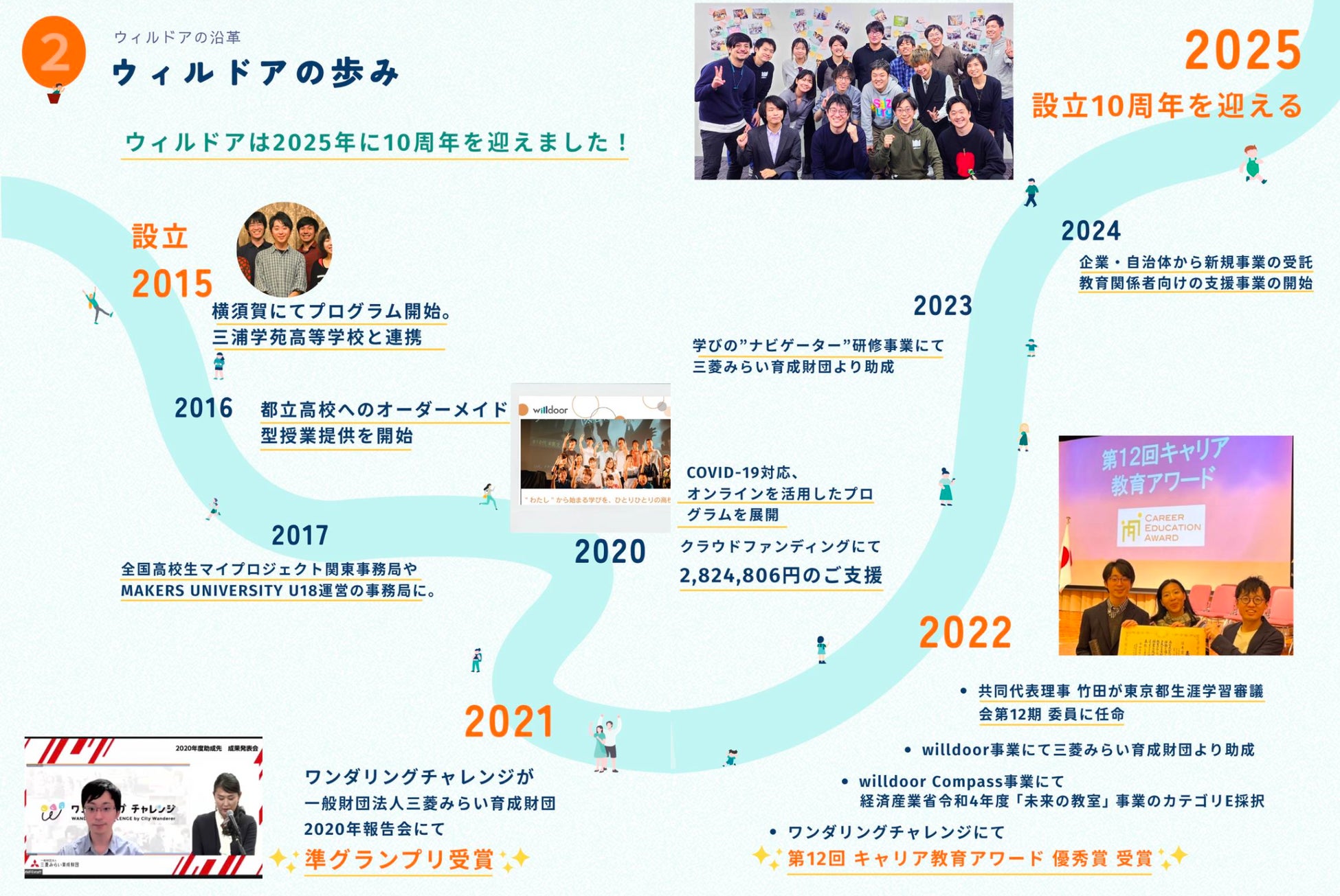 一般社団法人ウィルドア(所在地:神奈川県川崎市中原区1丁目794 静観ビル 301、共同代表理事:竹田和広、武口翔吾)は、2025年7月をもって設立10周年を迎えました。これまで全国の中高生を中心に、探究・キャリア支援・居場所づくりなどの活動を展開し、累計5万人以上の10代に学びや出会いの機会を届けてきたウィルドアは、10周年を記念し、10年間の歩みとこれからの挑戦を伝える「10周年特設サイト」を公開いたしました。