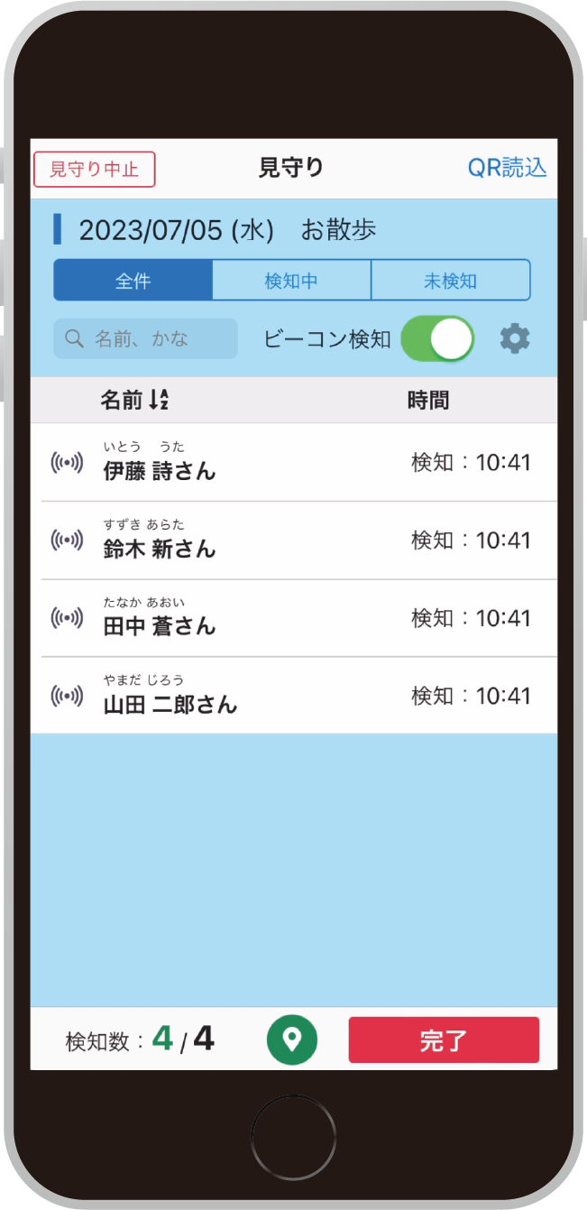 びーこんうぉっちは、アプリで手軽に人数確認を行えます。さらに、見守り中に園児が遠くへ行ってしまった場合、先生のスマートフォンにお知らせします。
