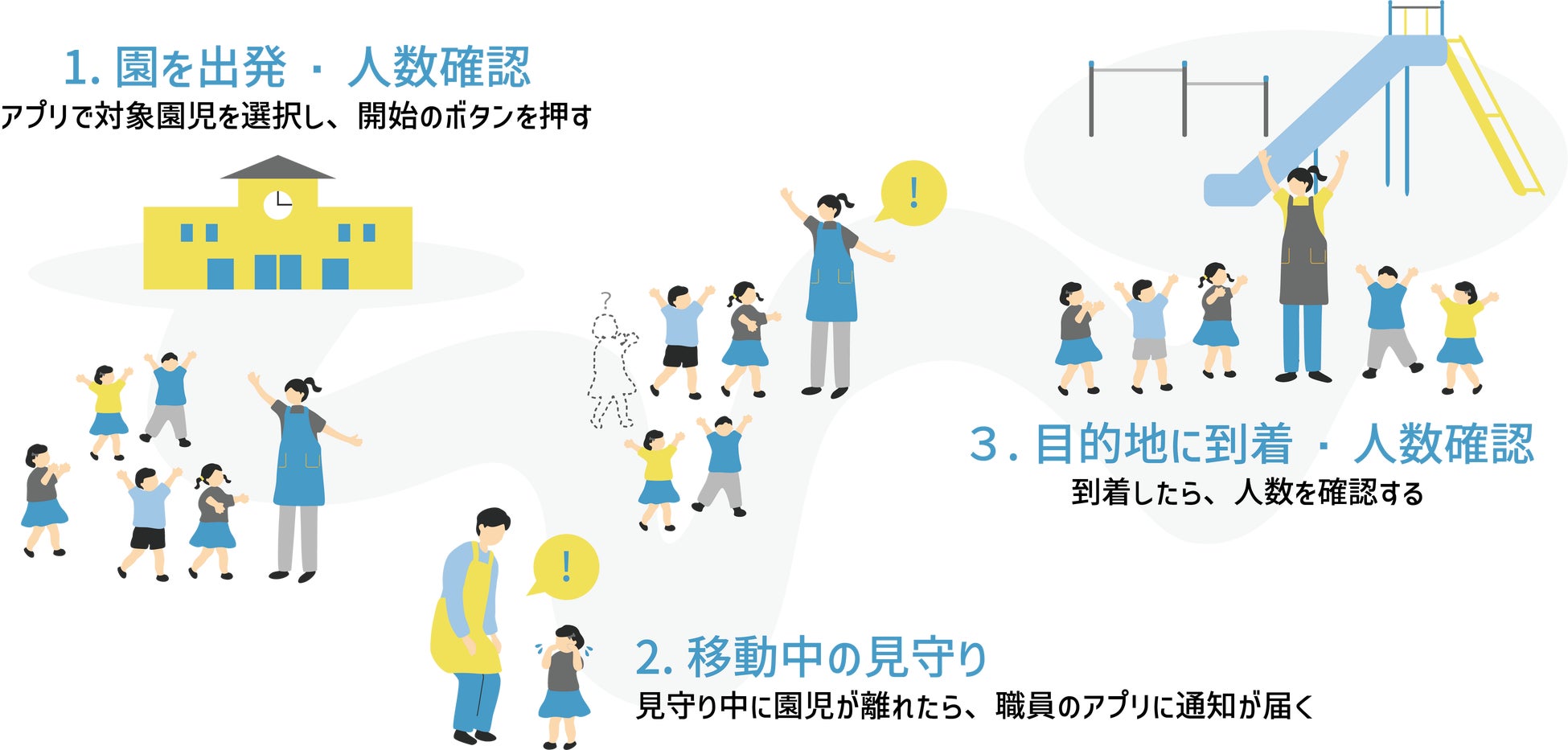 園児が持つビーコンの電波を、先生が持つスマートフォンが受信し、園児が近くにいることを検知します。ビーコンの電波が受信できなくなると、園児がいないと判断し、先生のスマートフォンに通知を送ります。