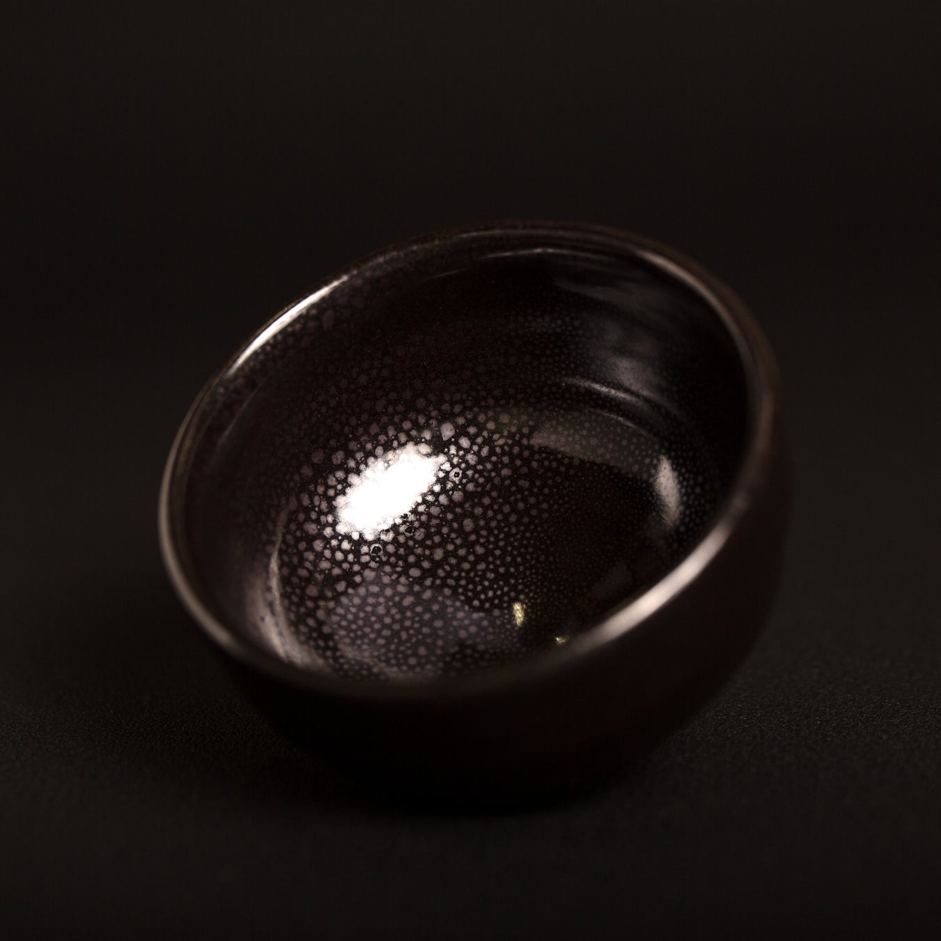 生チョコレートを召し上がっていただいた後も、器を長くご使用いただけるようにこだわって作成しています。天目のシェイプが特徴的で銀色の斑紋が無数に散らばる大変美しく高級感のある「油滴天目(ゆてきてんもく)」をぐい呑みにアレンジいただき、今年も引き続き山形県の伝統陶器である新庄東山焼にて完全オリジナルで作成していただきました。ひとつひとつ手焼きで専用に仕上げていただくここでしか手に入らないで美しいプレミアムな酒器です。
