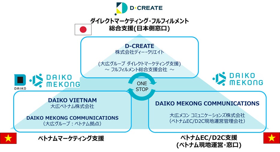 大広メコンが保有するベトナム国内向けメーケティングやEC/D2C販売の知見と、ディー・クリエイトが保有するダイレクトマーケティング及び、総合フルフィルメント(貿易・物流/倉庫)、及び顧客対応等の運営サービスの知見を融合。クライアント企業の商品の仕入れ販売を大広メコンが行い、商品の一般貿易(国際輸送・物流/倉庫)運営管理、顧客サポート支援をディー・クリエイトが行います。各販売チャネルを通じて取得した顧客データのマネージメントやベトナム現地ECの運営サービスをホーチミン市に拠点を置く大広メコンが行い、ワンストップでの販売サービスを提供します。本事業を通じ、クライアント企業のベトナム進出ならびに、ブランド販売を支援することで、日本企業のグローバル事業拡大に貢献してまいります。